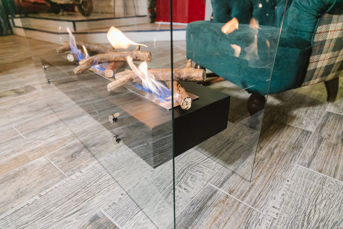 Представляет собой цельный металлический каркас с топливным блоком Lux Fire 500 М, закрепленный на 8 дистанционных держателях к защитным стеклам, создавая эффект «воздушности».