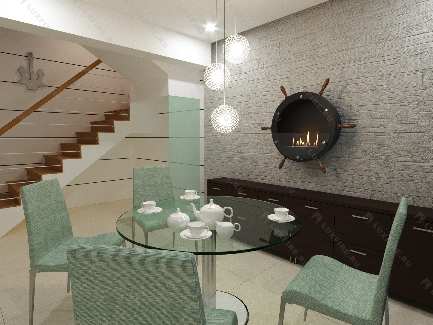 Представляет собой сборную металлическую конструкцию круглой формы класса XS в виде штурвала корабля , создающую полузакрытое безопасное пространство для огня с топливным блоком Lux Fire 250 XS ограниченную закаленным стеклом в котором горит живой огонь с углом обзора 180 градусов. Универсально подходит для встройки в нишу или подвеса на стену.